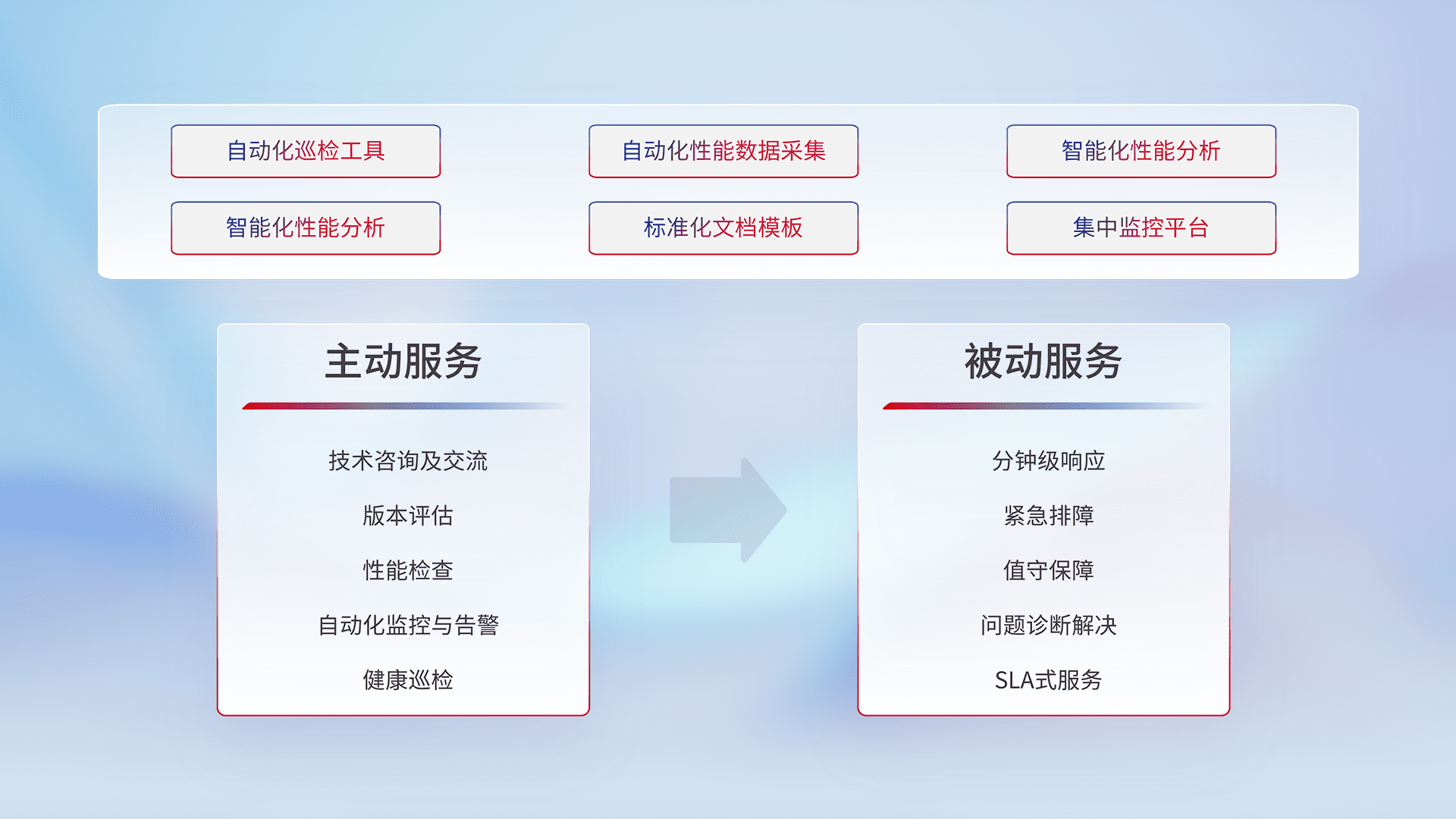 智能化工具和标准化文档,,,保障服务质量,,,提供主动服务(包含技术咨询、、、版本评估、、、性能检查、、自动化监控与告警、、健康巡检)和被动服务包含(分钟级响应、、紧急排障、、、值守保障、、、问题诊断解决、、、、SLA服务)。。。